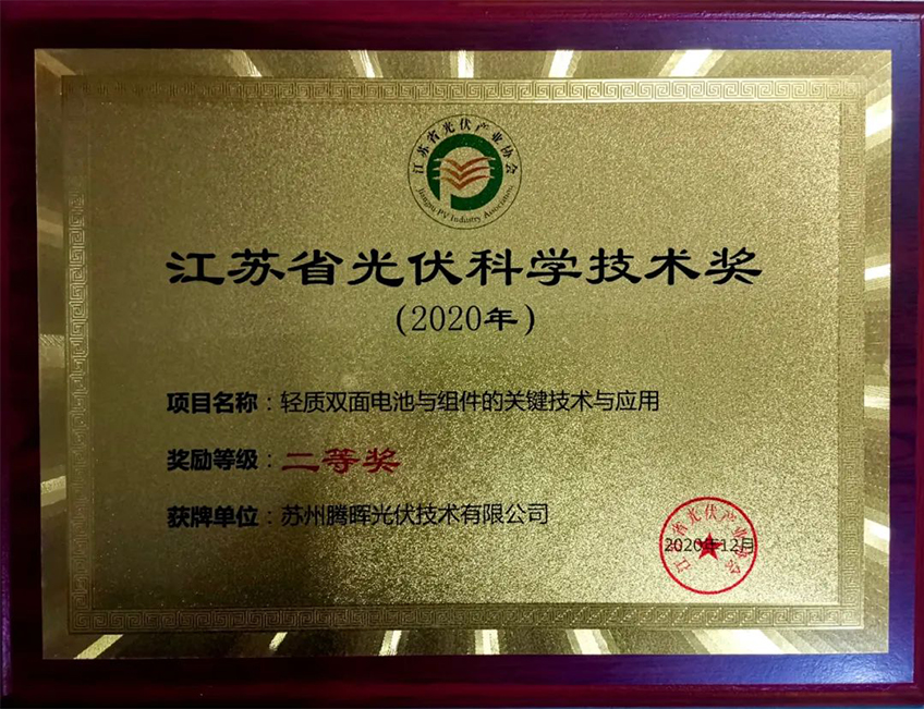 2020年12月4日至5日,由江蘇省光伏產(chǎn)業(yè)協(xié)會(huì)主辦的江蘇省光伏產(chǎn)業(yè)協(xié)同發(fā)展大會(huì)在南京召開(kāi)。會(huì)議以“協(xié)同、創(chuàng)新、強(qiáng)鏈、提質(zhì)”為主題,匯聚光伏產(chǎn)業(yè)專(zhuān)家,搭建合作交流平臺(tái),共同探討行業(yè)發(fā)展方向,繪制江蘇省光伏產(chǎn)業(yè)健康發(fā)展藍(lán)圖。大會(huì)現(xiàn)場(chǎng)頒發(fā)了2020年度江蘇省光伏產(chǎn)業(yè)協(xié)會(huì)光伏科學(xué)技術(shù)獎(jiǎng)。騰暉光伏憑借“輕質(zhì)雙面電池與組件的關(guān)鍵技術(shù)與應(yīng)用”項(xiàng)目榮獲科學(xué)技術(shù)獎(jiǎng)二等獎(jiǎng)。