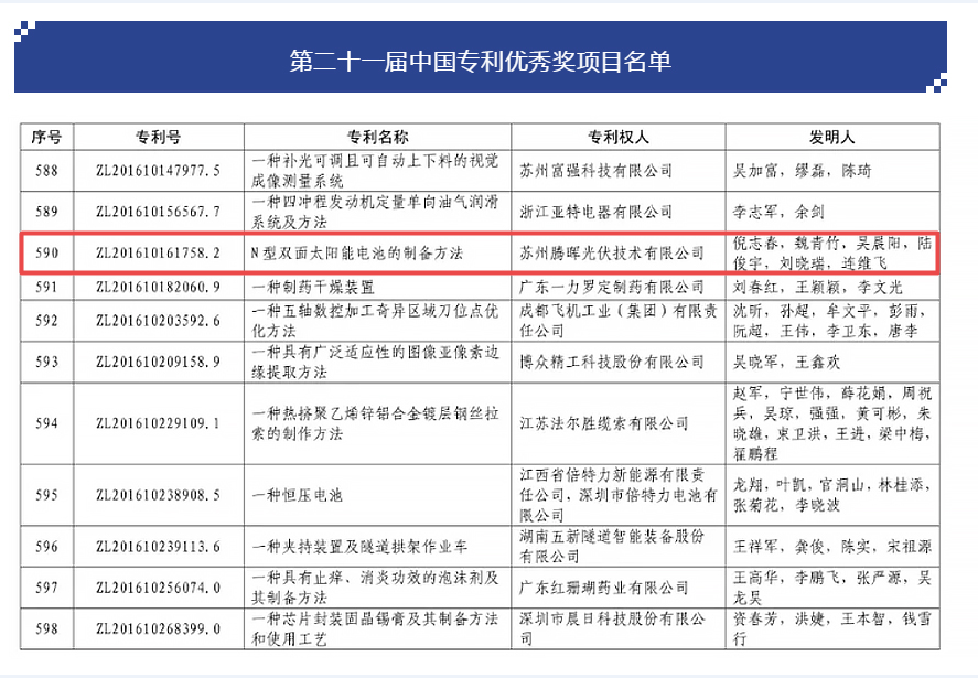 近日,國家知識產(chǎn)權(quán)局發(fā)布了第二十一屆中國專利獎預(yù)獲獎項名單,蘇州騰暉光伏技術(shù)有限公司的“N型雙面太陽能電池的制備方法”(ZL201610161758.2)專利榮獲中國專利獎優(yōu)秀獎。
